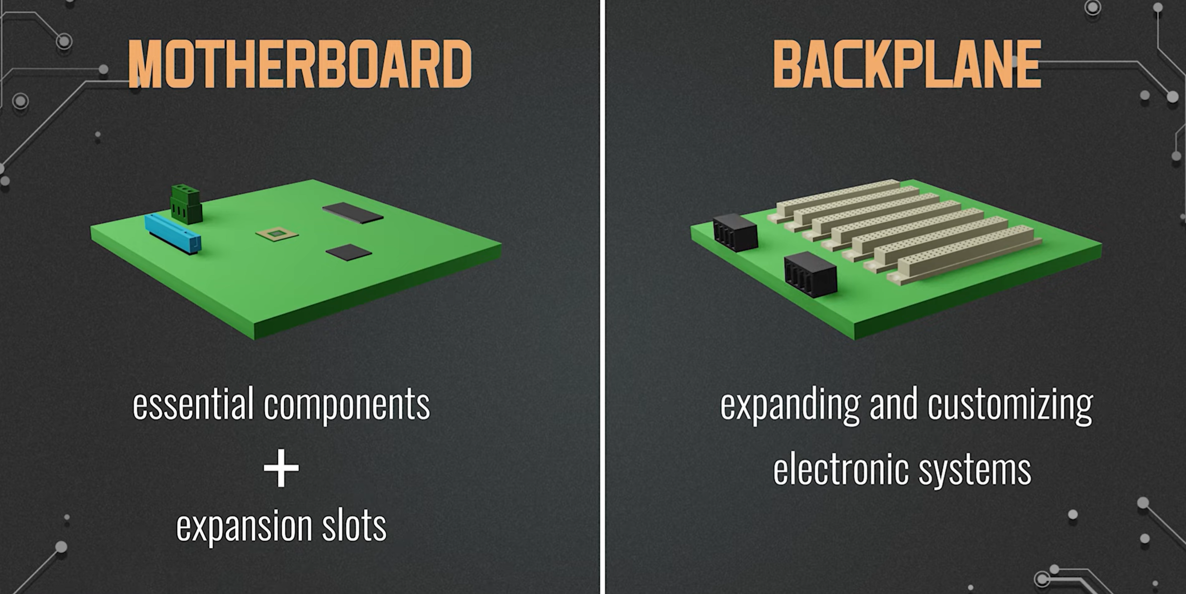 Una placa posterior es una placa de circuito electrónico que contiene circuitos y enchufes en los que se pueden conectar dispositivos electrónicos adicionales en otras placas de circuito o tarjetas.